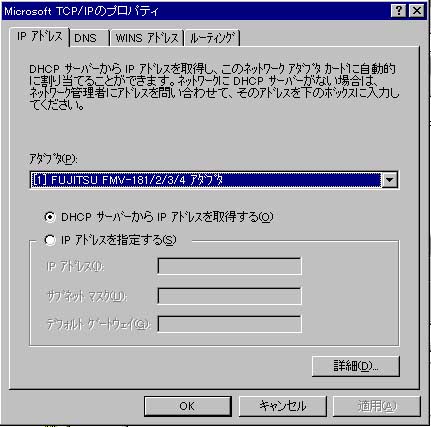 「IPアドレス」に画面を切り替え、アダプタを該当するLANカードを選択し、「DHCPサーバからIPアドレスを取得する」をチェックする。