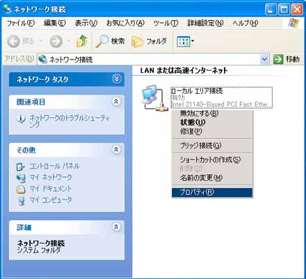 「ローカルエリア接続」アイコンを右ボタンでクリックしプロパティーを選択する。