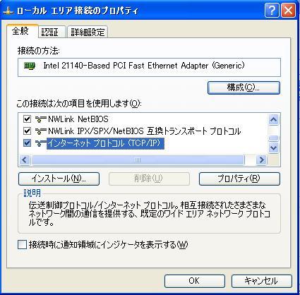「インターネットプロトコル(TCP/IP)」を選択し、プロパティーをクリックする。