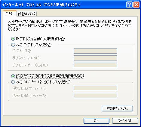 「IPアドレスを自動的に取得する」と「DNSサーバのアドレスを自動的に取得する」をチェックする。