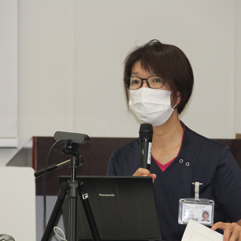 第2部では、第1部で症例発表があった患者さんの看護記録についてに発表していただきました。元々は術後1週間で退院する予定だったが、創部感染や食道瘻孔などで入院が長期化。ベッド上で動けないことへのストレス、声がでないことへのストレス等が重なり、一時は気持ちが落ち込むこともあったが、少しずつ小さな目標をクリアしていくことで、ご家族や医療スタッフとのコミュニケーションも増えていき、本来の前向きな性格に戻っていかれたそうです。発表後の質疑では、HCUで担当していた看護師より患者さんとの筆談でのやりとりが読み上げられ、HCUから一般病棟に移られる際に、身体面での引き継ぎはもちろんのこと、患者さんがどういった気持ちで過ごされていただのかという精神面の引き継ぎをしっかりしておくことでスムーズな看護につながるのではないかという座長の竹林師長のまとめで終了しました。