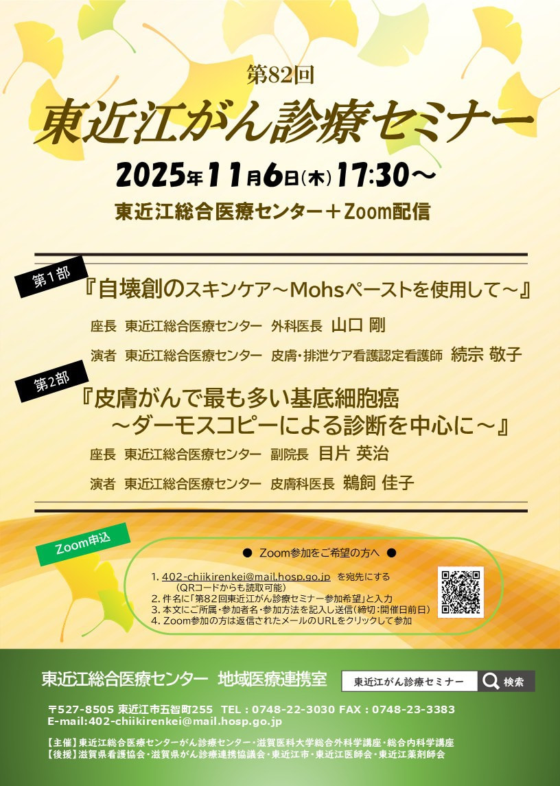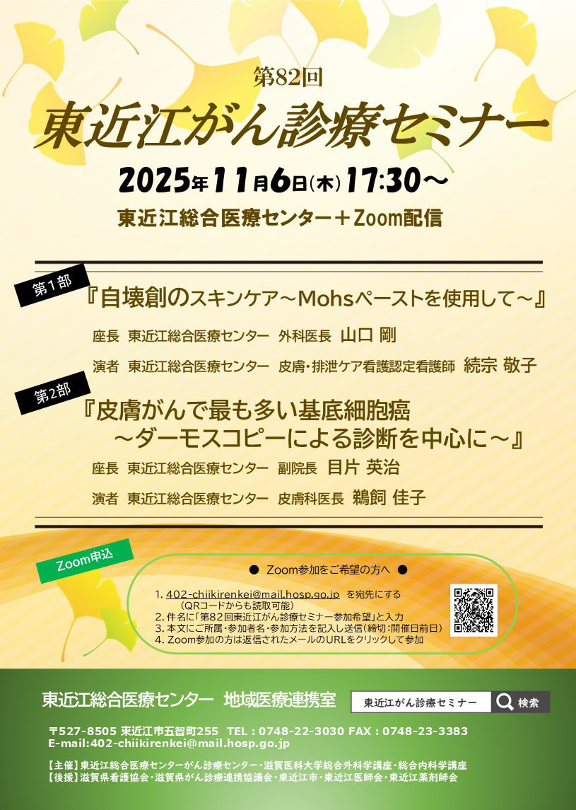 次回『第82回東近江がん診療セミナー』は11/6(木)の開催予定(黒色細胞腫(メラノーマ))です。