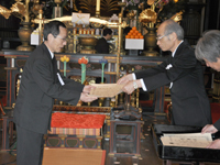 法要終了に引き続き、故人(献体者)に対する文部科学大臣の感謝状を学長からご遺族代表にお渡しし、併せて、学生の手によりご遺骨をお返ししました。