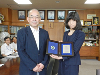表彰伝達式は平成26年8月7日(木)に学長室にて行われ、役員立会いの下、塩田学長から記念の盾が手渡されました。