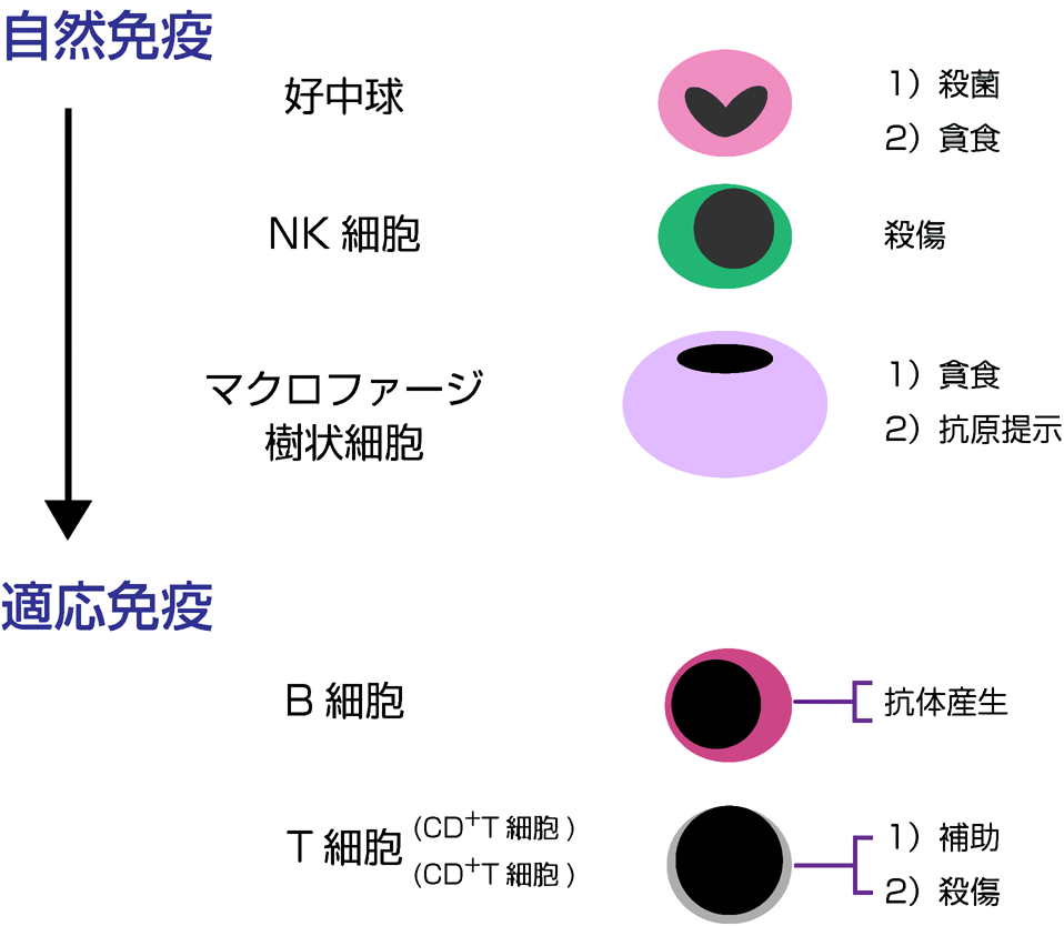 自然免疫には、主としてマクロファージ、好中球等が関与します。これらの細胞は、主として抗原を食べて処理します。