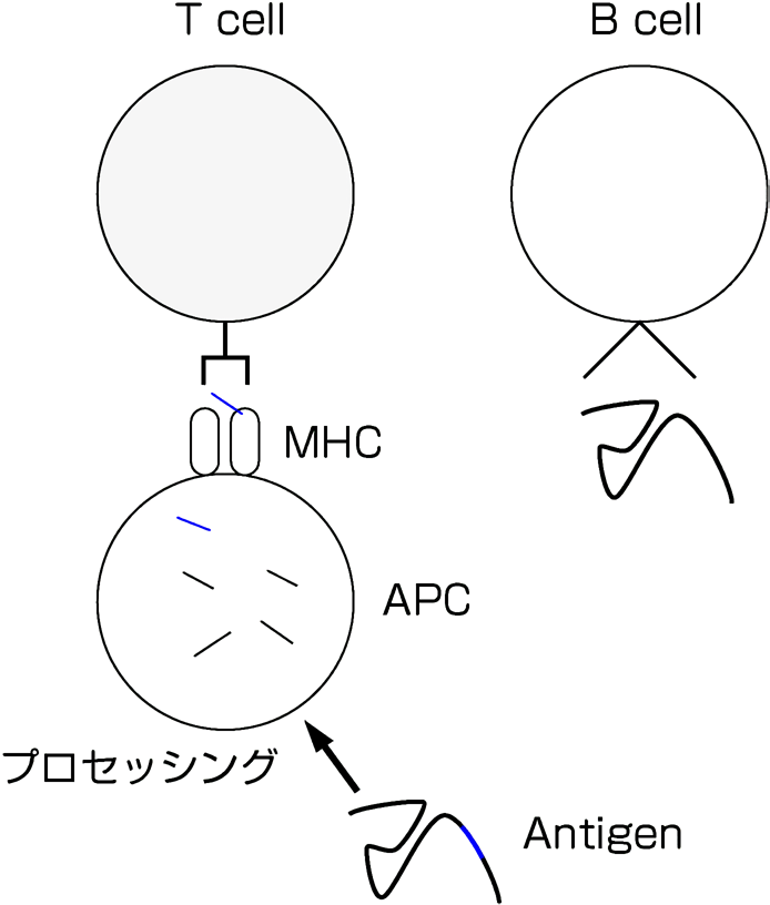 Tリンパ球(左)は細胞表面にある抗原を認識します。しかも蛋白質(図のAntigen)が分解された「ペプチド」(図の青い部分)が「主要組織適合抗原(MHC)」に結合した状態の抗原を認識します。抗原を分解することを「プロセッシング」といいます。