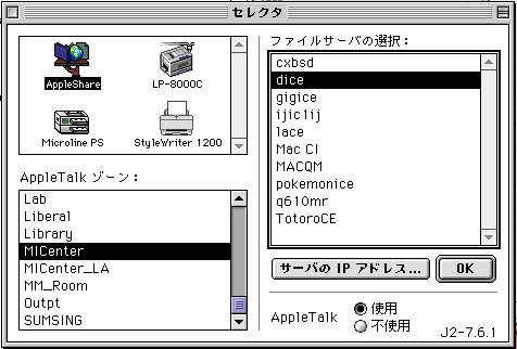 - Apple Share及びMICENTERを選択するとサーバの一覧がでる。