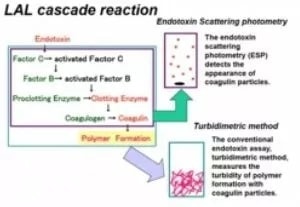 従来臨床検査などでエンドトキシン測定を行っ ています。 その原理は無脊椎動物のカブトガニが、グラム陰性菌の感染に対抗して、血中のAmebocyteというリンパ球に似 た細胞に含まれる成分を使って、エンドトキシンに特異的な反応を起こし、タンパク 質の塊を形成して傷口を塞ぐという現象を利用しています。高等動物のフィブリンの 形成に似ています。当初は、患者血漿を様々に希釈し、その塊(ゲル化)を起こす最大希釈濃度を,エンドトキシン濃度として測っていました(ゲル化法)。 もう少し精密にゲル化過程を測ろうと、濁度変化を目安にゲル化反応速度から濃度を決める方法が作られました(比濁時間法)。 ただこの方法で臨床試料を測っても「結果が出ない」「時間が掛かる」「出た結果で症状の説明が出来ない」という評価が多くなされ、問題になっていました。 その過程を再検討して、「ゲル化を均一に行うため、反応溶液を攪拌する(溶液全体のゲル化が阻止されてしまう。 代わりに小さなゲル粒 子が形成される)」という今までの発想からは出なかった方法で反応を行い、その結果形成されるゲル粒子を、レーザーを当てて生じる散乱光として検出し、エ ンドトキシンの反応速度を測定するようにしたのがESP法です。