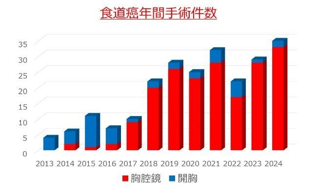 ・食道癌に対する手術は年間約30例で滋賀県内では最も多くの手術を行っています。傷が小さく、低侵襲を目指した胸腔鏡手術を積極的に行っております。