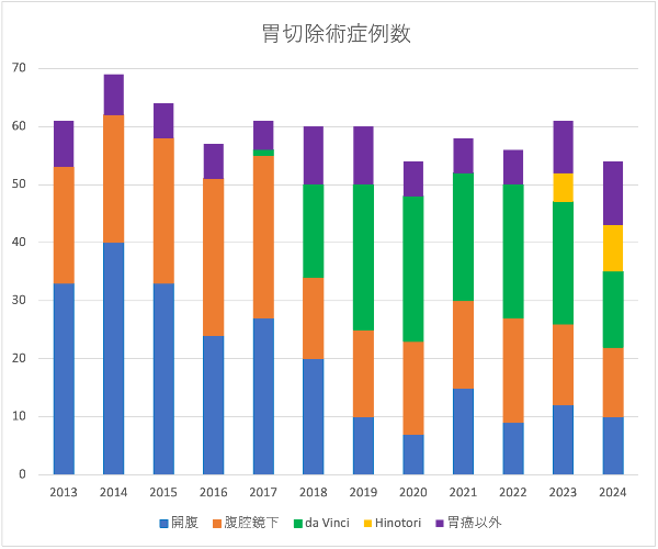 胃の手術症例は局所切除を除き年間50例を超えます。このうち 約半数はロボット手術を、3-4割は腹腔鏡手術を行っています。