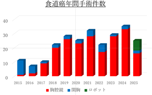 ・食道癌に対する手術は 年間約30例で 滋賀県内では最も多くの手術を行っています。 傷が小さく、低侵襲を目指したロボット支援下手術、胸腔鏡手術を積極的に行っております。