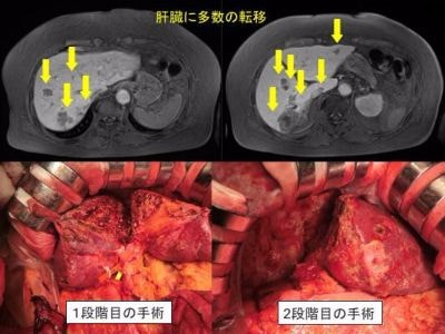 最近、食事の欧米化にともない大腸がんが増加し、男性ではがん死亡の3位、女性では1位になっています。大腸がんの治療ガイドラインでは、大腸がんの肝転移は、根治手術が可能な場合は、他の治療方法(抗がん剤など)とくらべて、手術が良好な成績であると明記されています。ただし、肝臓に数多く転移がある場合も少なくありません。切除の可能性を診断するためには専門的な知識が必要であるため、肝臓外科専門施設でなければ、本当は手術できる状態なのに手術できないと判断される場合があります。当院では、多発転移肝がんであっても、さまざまな工夫を用いて、切除を行っています。滋賀医科大学附属病院では日本で施行している施設が少ないアルプス(Associating Liver Partition and Portal vein embolization for Staged hepatectomy; ALPPS)手術にも取り組んでいます。ぜひ一度、ご相談ください。