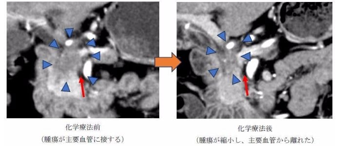 膵癌に対しては、外科切除が唯一、治癒が見込める治療法です。近年では、以前では切除不能とされてきた局所進行切除不能膵癌に対しても術前化学療法などを施行して外科的に切除することがあります。また、遠隔転移を有する膵癌に対しても化学療法で病勢コントロールできている場合に限り外科的に切除することで、非切除例よりも良好なことが、世界的に報告されています。わたしたちも切除不能膵癌に対しても、化学療法が非常によく効き完全切除が可能となれば、身体の状態も考慮した上で積極的に外科的切除を行っております。