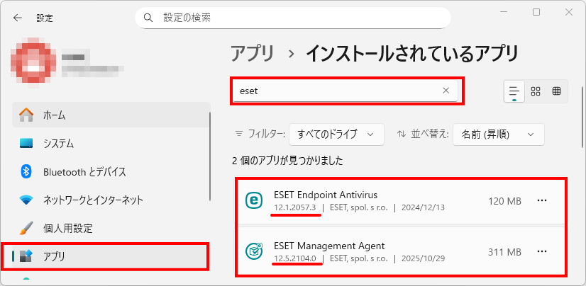 - Windowsボタン>設定>アプリを表示し、「ESET」と検索する