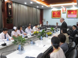 4月11日(木)、訪問団は、ホーチミン市のチョーライ病院とホーチミン医科薬科大学を訪れました。チョーライ病院と本学は、2006年に国際交流協定を締結し、心臓血管外科、放射線部、看護部などを中心に、技術指導や人材交流を行い、教育面でも医学部学生が同病院で自主研修を行うなど、密接な協力関係を築いてきました。今回の訪問では、Tran Minh Truong副病院長、Huynh-Le Phuong脳神経外科長らと、鈴木特任教授の脊髄再生臨床試験の計画を中心に意見交換を行い、今後は共同研究を具体化するために担当者間で詳細を討議することになりました。なお、本学附属病院看護部の河田師長、中島師長が、チョーライ病院で翌12日(金)に開催された国際シンポジウムで発表するために、現地で訪問団と合流しました。国際シンポジウムの前夜に開催されたガラ・パーティには、塩田学長と訪問団が主賓として招待され、Nguyen Van Khoi院長、Tran Minh Truong副病医院長らと歓談しました。