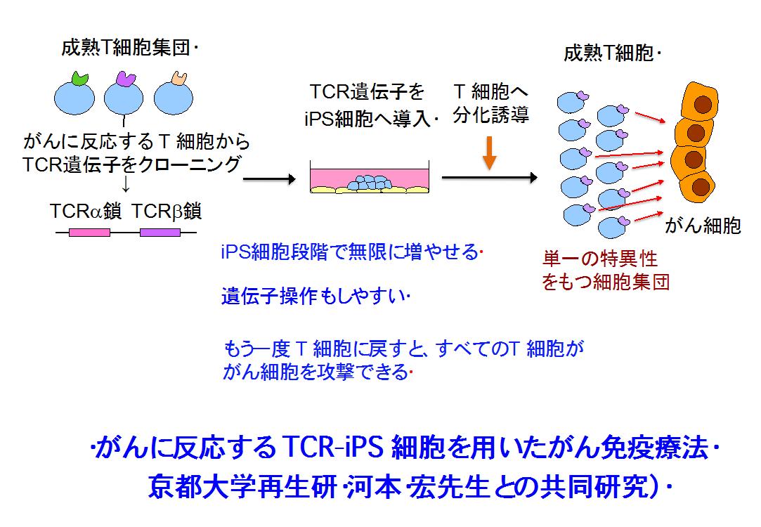 活性化したT細胞に外来性のTCR遺伝子を導入しても、元々のTCRが発現しているため、外来性のTCRが十分に発現しないことがあります。そこで、MHCホモサル由来のiPS細胞に、がんに反応するTCR遺伝子を導入してからT細胞へ分化誘導することにより、導入したTCRを高発現させ、かつがんを殺傷する活性の高いT細胞を再生することを目指します。(この研究は、京都大学 ウイルス・再生医科学研究所 再生免疫学分野の河本 宏教授と共同で行います。(疾患制御病理学、分子生理化学)