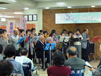 午後からは、「瀬田東ハーモニカクラブ」の皆さんによるコンサートが開かれ、全10曲が演奏されました。入院患者さんをはじめ、たくさんの方々が来場され、澄んだ音色で奏でられる懐かしい曲にあわせ、一緒に口ずさむみながらコンサートを楽しんでおられました。