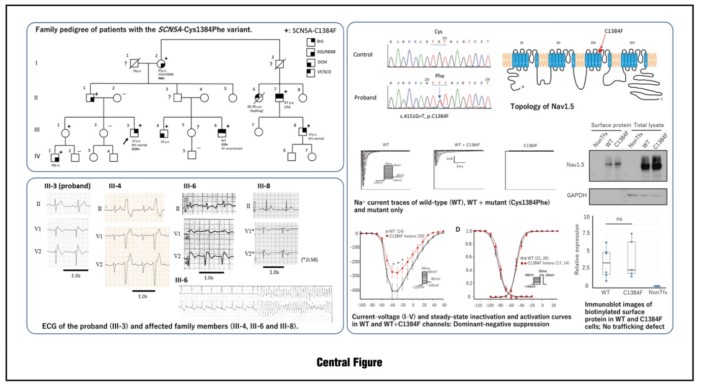 【要旨】本研究では、4世代15名からなる日本人家系を対象に、Nav1.5 をコードする SCN5A 遺伝子の新規バリアント Cys1384Phe を同定し、その臨床的および機能的特徴を検討した。本家系では、Brugada 症候群(BrS)、洞不全症候群(SSS)、拡張型心筋症(DCM)が同時に認められ、同一変異を有しながらも、無症候性の例から心室細動(VF)反復例まで、多彩な表現型が出現していた。ターゲットパネルシーケンスと Sanger 法により、Nav1.5 の domain III–pore 領域に位置する Cys1384Phe 変異が複数の罹患者およびその家族に確認された。