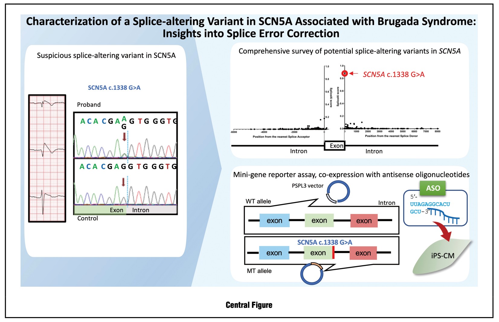 【要旨】本研究では、薬物負荷により Brugada 型心電図を呈した患者から、SCN5A 遺伝子 exon 10 末端の c.1338G>A という新規一塩基置換を見出し、そのスプライス異常への影響と是正可能性を検討した。SpliceAI による in silico 解析では、本変異は正規のスプライスドナー部位を喪失させ、4 塩基下流のクリプティックスプライス部位の強い使用を誘導すると予測され、同一領域の全 SNV の中でも突出したスコアを示した。患者末梢血から得た cDNA では異常産物が検出されず、ナンセンス関連mRNA 分解により不完全産物が除去されていることが示唆された。