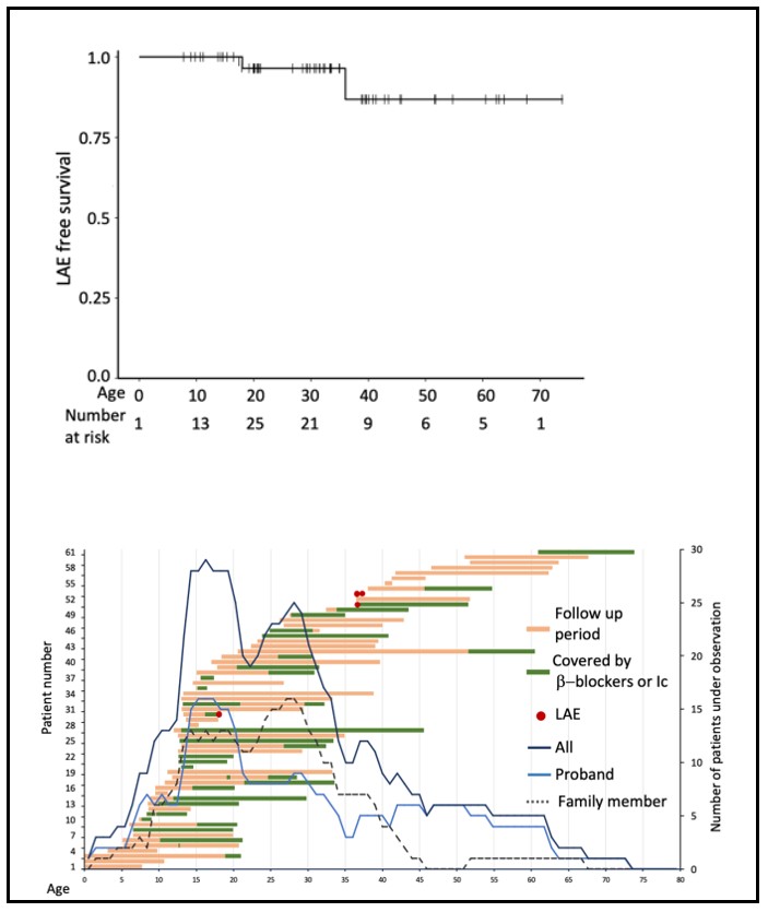 【要旨】KCNJ2 遺伝子変異による Andersen–Tawil 症候群(ATS)は、長らく致死的不整脈の頻度が低い比較的良性の疾患と考えられてきたが、近年の欧州データでは高い致死性イベント率が報告され、リスク層別化の再検討が求められている。本研究では、日本の KCNJ2 変異保因者 61 名を対象に長期不整脈アウトカムを解析し、欧州報告と比較した。学校心電図検診を契機とした若年での受診が多く、左切断右打ち切り解析では 20 歳時点の致死性不整脈イベント(LAE)回避率は 96.4%、40 歳時点で 86.8%であった。観察期間中の年間 LAE 発生率は 0.25% と欧州の 1.5% を大きく下回り、アミオダロンの不使用や早期診断が関連している可能性が示唆された。一方、30〜40 歳代でのイベントリスクは一定程度存在し、長期フォローアップの重要性が確認された。本研究は、日本における ATS の実臨床リスクを示す初の長期データであり、地域差を踏まえた適切な管理方針の確立に貢献する。